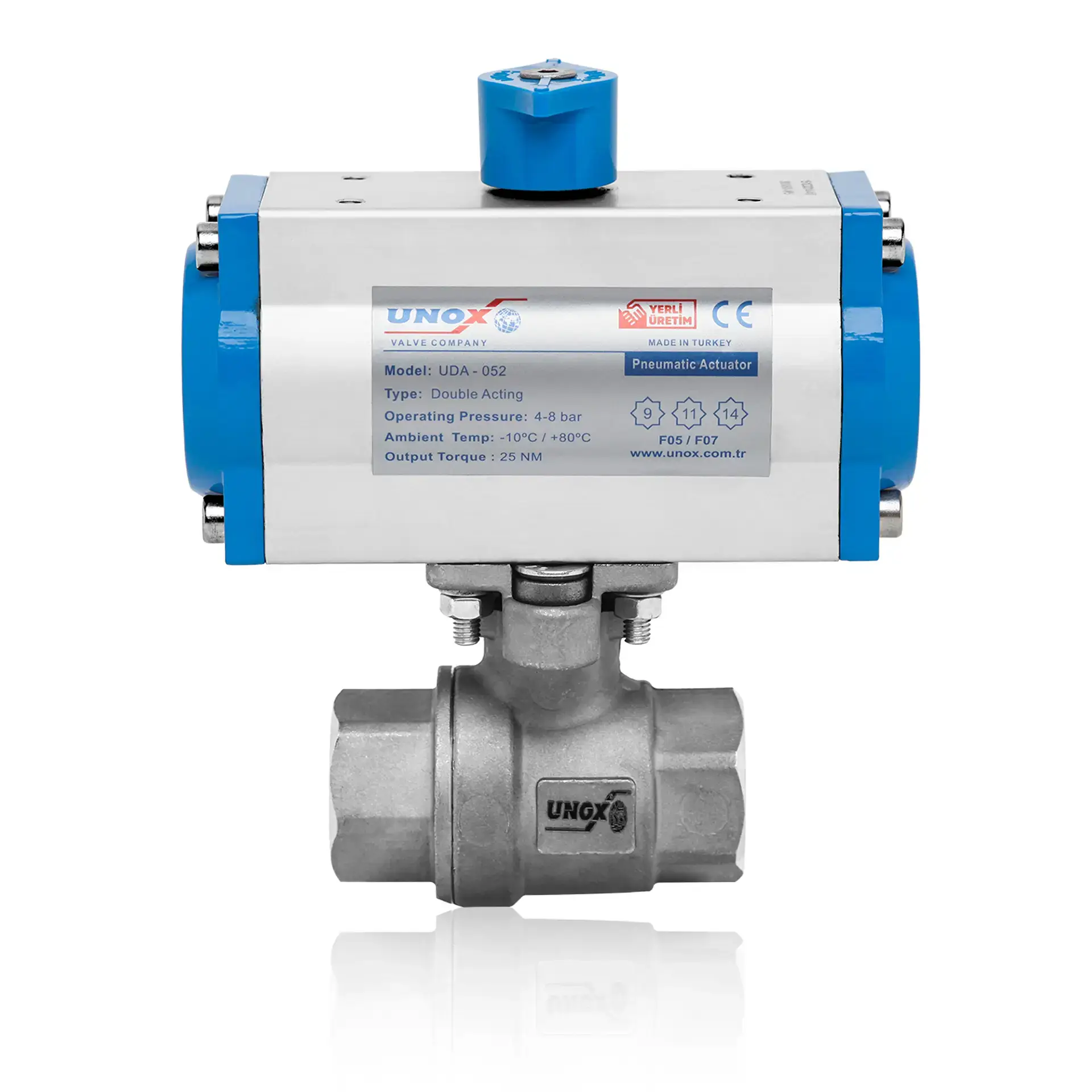 The UNOX 2 Pieces Stainless Steel Ball Valve with Double Acting Pneumatic Actuator – Threaded combines robust stainless steel construction with precise pneumatic automation, making it the perfect solution for industrial fluid control systems where durability, safety, and efficiency are critical.