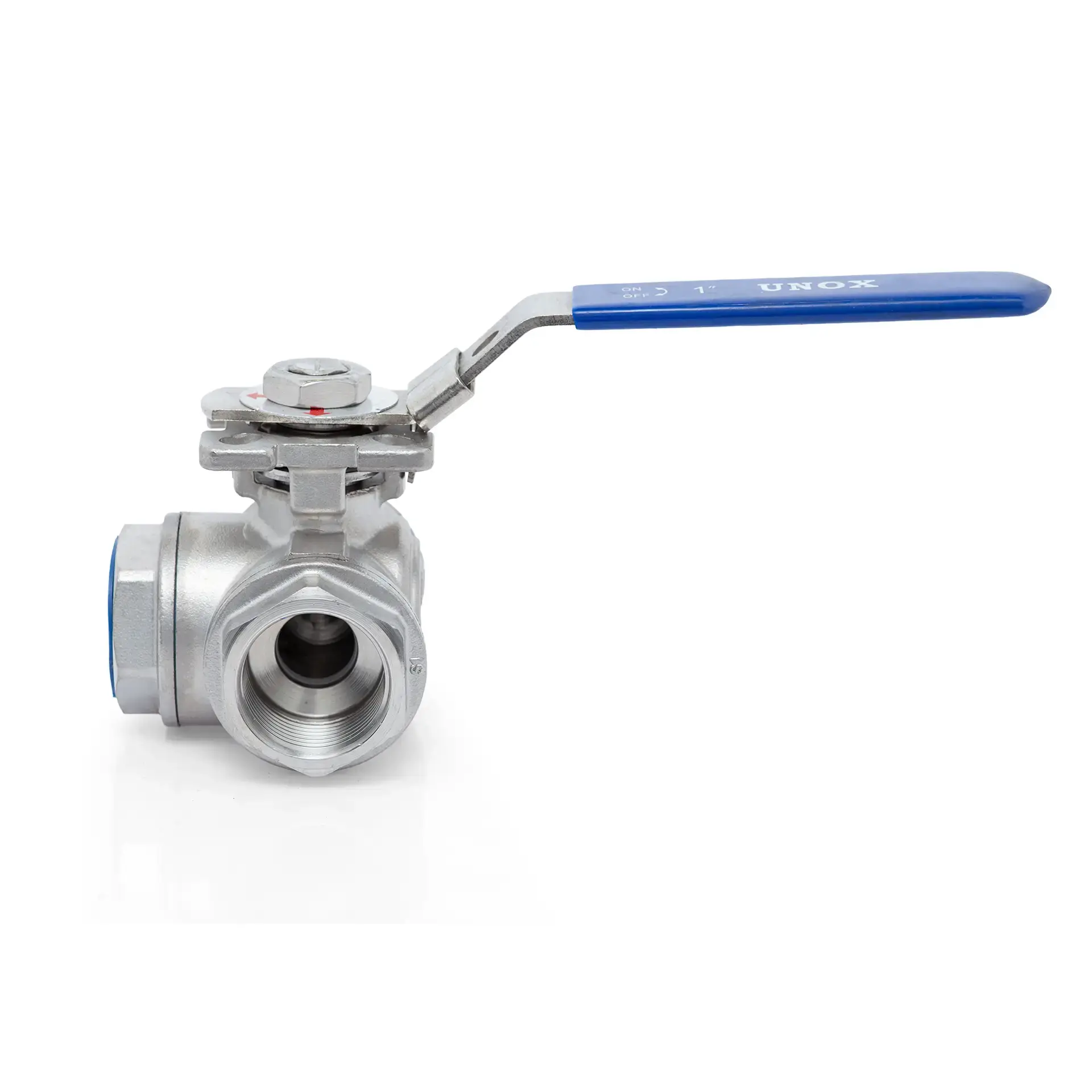 The UNOX 3 Way Stainless Steel L-Port Ball Valve with Mounting Pad – Threaded is a high-performance flow-diverting valve designed to route fluids between two different pipelines with precise control. Built entirely from AISI 304 or AISI 316 stainless steel, it provides outstanding corrosion resistance and mechanical strength, making it ideal for chemical processing, food & beverage, water treatment, pharmaceutical, marine, and HVAC systems.